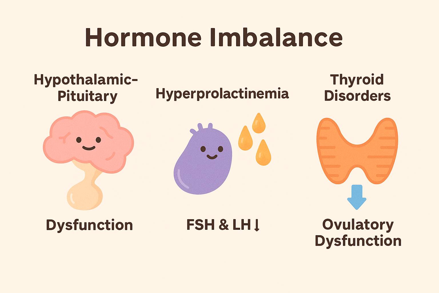 → 결과적으로 FSH·LH 분비 억제 → 배란 정지 - 갑상선 기능 항진증일 때는 신진대사가 빨라지고 시상하부 호르몬 리듬이 불안정해져 역시 배란 주기가 망가집니다.